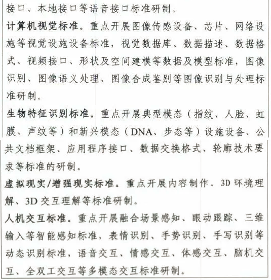 E關(guān)鍵領(lǐng)域技術(shù)標(biāo)準(zhǔn)主要圍繞自然語言處理、智能語音、計算機視覺、生物特征識別、虛擬現(xiàn)實/增強現(xiàn)實、人機交互等方面,為人工智能應(yīng)用提供領(lǐng)域技術(shù)支撐;