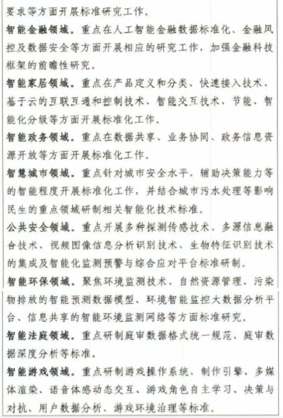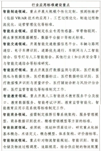 到2023年,初步建立人工智能標(biāo)準(zhǔn)體系,重點研制數(shù)據(jù)、算法、系統(tǒng)、服務(wù)等重點急需標(biāo)準(zhǔn),并率先在制造、交通、金融、安防、家居、養(yǎng)老、環(huán)保、教育、醫(yī)療健康、司法等重點行業(yè)和領(lǐng)域進行推進。建設(shè)人工智能標(biāo)準(zhǔn)試驗驗證平臺,提供公共服務(wù)能力。
