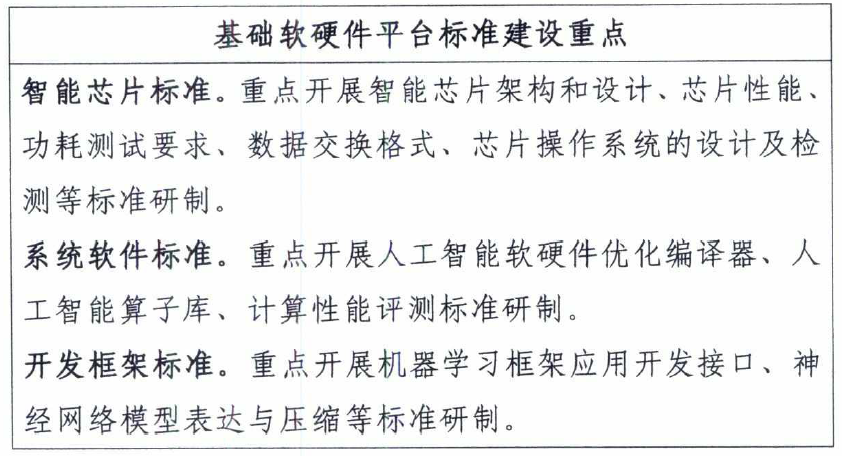 1.智能芯片標(biāo)準(zhǔn)。規(guī)范智能計算芯片、新型感知芯片及相關(guān)底層接口等,為人工智能模型的訓(xùn)練和推理提供算力支持。包括指令集和虛擬指令集、芯片性能、功耗測試要求、數(shù)據(jù)交換格式、芯片操作系統(tǒng)的設(shè)計及檢測等標(biāo)準(zhǔn)。