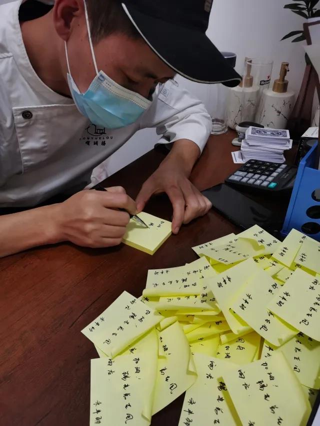 餐廳為涉疫辦公大樓滯留人員暖心送餐,并在每份餐食上貼上鼓勵紙條“風(fēng)雨同舟,一起加油,戰(zhàn)勝疫情”。