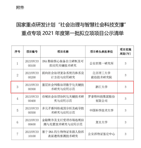 由浙江大學(xué)牽頭的“基層社會(huì)網(wǎng)絡(luò)治理數(shù)字化關(guān)鍵技術(shù)研究與應(yīng)用示范”項(xiàng)目獲批成為2021年第一批國(guó)家重點(diǎn)研發(fā)計(jì)劃“社會(huì)治理與智慧社會(huì)科技支撐”重點(diǎn)專(zhuān)項(xiàng)。項(xiàng)目圍繞“社會(huì)治理新模式、社會(huì)治理要素、時(shí)空大數(shù)據(jù)關(guān)聯(lián)方法、社會(huì)多元感知技術(shù)、事件管理、人員畫(huà)像軌跡、社會(huì)基層網(wǎng)格治理示范“等目標(biāo)進(jìn)行研究。