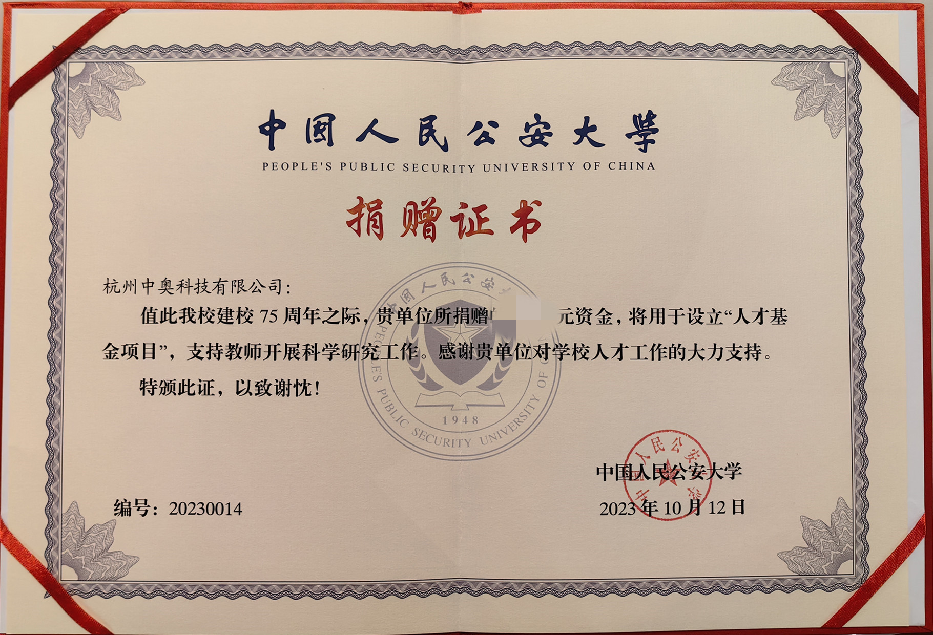 10月12日,在中國人民公安大學迎來75周年校慶之際,由中國教育發(fā)展基金會牽頭,中奧科技、科大訊飛、美亞柏科等多家高新技術(shù)企業(yè)共同發(fā)起“人才基金項目”。該基金旨在支持中國人民公安大學人才培養(yǎng)、師資建設(shè),向鍛造一流公安人才隊伍目標邁進。杭州中奧科技有限公司作為該基金成員單位,積極參與該基金的發(fā)起與運作,并與中國人民公安大學正式簽約。