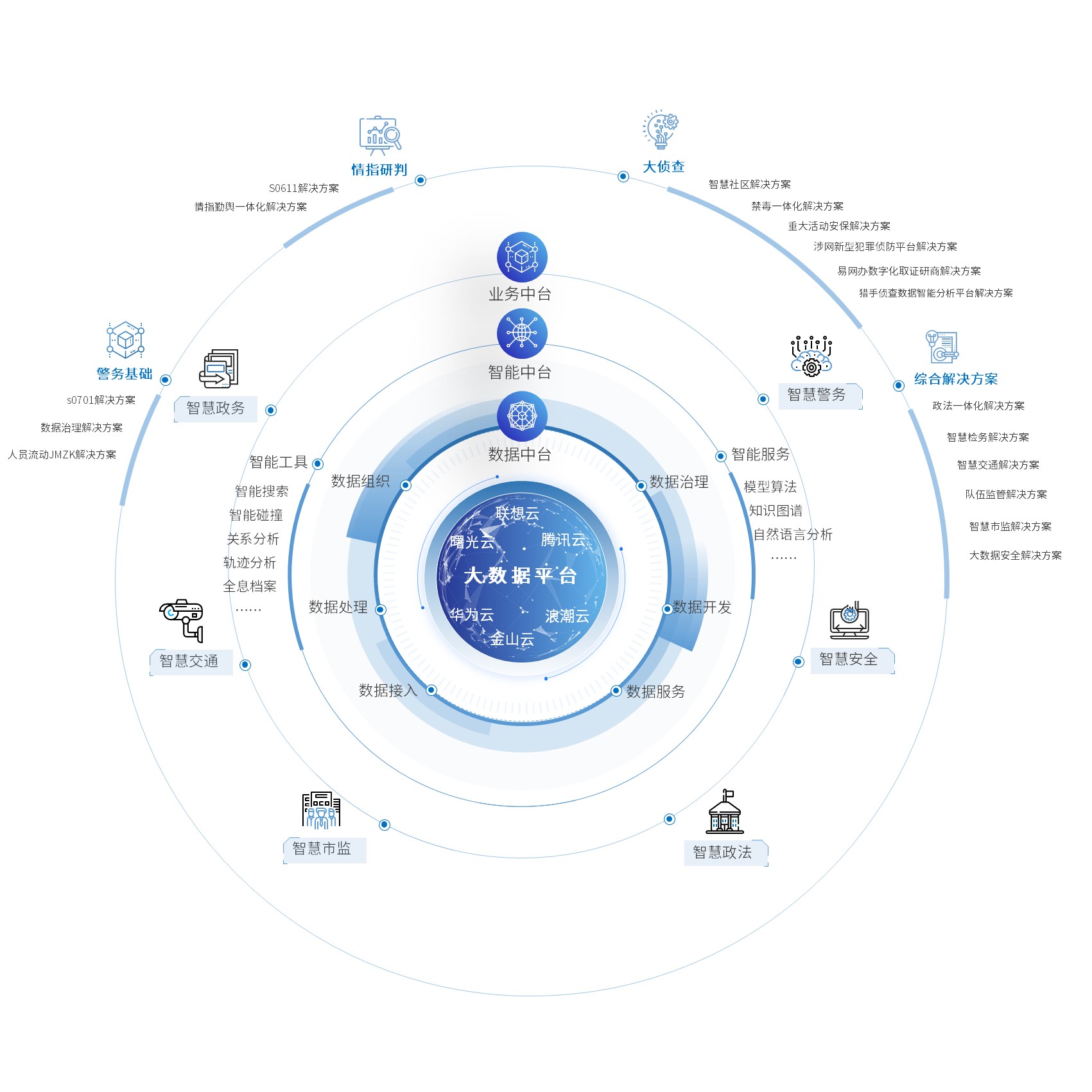 以政法委為核心,致力于為公、檢、法、司等全政法系統(tǒng)提供數(shù)智服務(wù),打造集政法信息資源共享、政法協(xié)同、部門辦案、專項信息、政法大數(shù)據(jù)等于一體的“政法大腦”,通過政法大數(shù)據(jù)分析,準(zhǔn)確把握執(zhí)法司法運(yùn)行態(tài)勢,科學(xué)調(diào)配執(zhí)法司法資源,提高決策科學(xué)化、精準(zhǔn)性、高效性,為各省、市政法體系司法資源優(yōu)化、司法效率提升、司法監(jiān)督強(qiáng)化提供智能支撐。